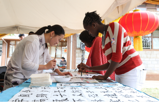 9月15日,在肯尼亚内罗毕,肯雅塔大学孔子学院的老师邓倩倩(左)在中秋节庆祝活动上指导学生们练习书法。(新华社)