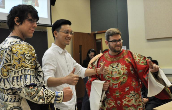 应美国普渡大学孔子学院邀请,上海京剧院演员近日走进普渡大学课堂,演员傅希如(中)与身着京剧戏服的大学生合影。(新华社)