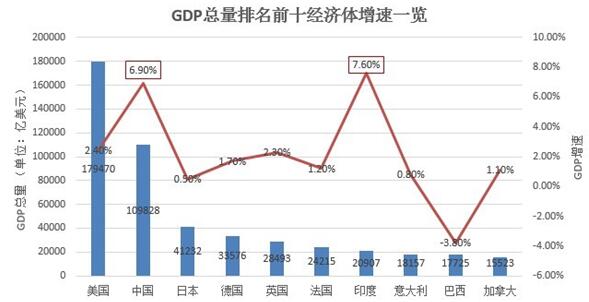 2016年二季度,我国GDP同比增长6.7%,好于预期的6.6%。这一速度尽管不及此前的两位数增长,但仅次于印度,排名全球第二。然而,我国在经济总量上基数较大,世界排名第二,仅次于美国,远超排名第三的日本,印度仅为我国的仅1/5。以2015年GDP总计67万6700亿元人民币计算,上半年我国GDP为340637亿元,对世界经济增长的贡献度仍远远高出其他经济体。