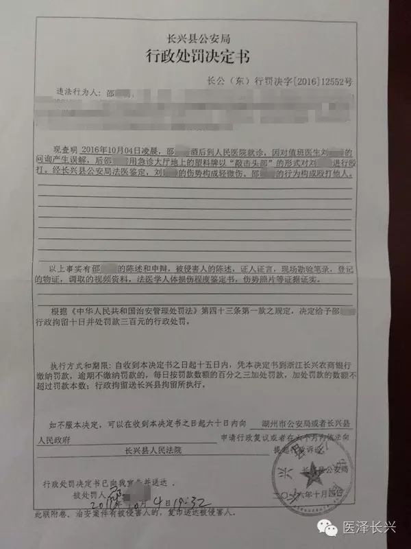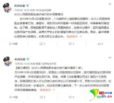 10月4日到5日长兴县公安局官方微博发布案情通报,打人者已被拘留,并处罚300元。通报称,“2016年10月4日凌晨3时许,邵某在人民医院就诊过程中,因对值班医生刘某问询产生误解,并将刘某头部打伤。目前,依据《治安管理处罚法》第四十三条规定,邵某因殴打他人行为已被公安机关处以行政拘留十日,罚款300元的处罚。刘某伤势正在进一步鉴定中,如达到刑事立案标准,下一步公安机关将依法对邵某采取刑事强制措施”。