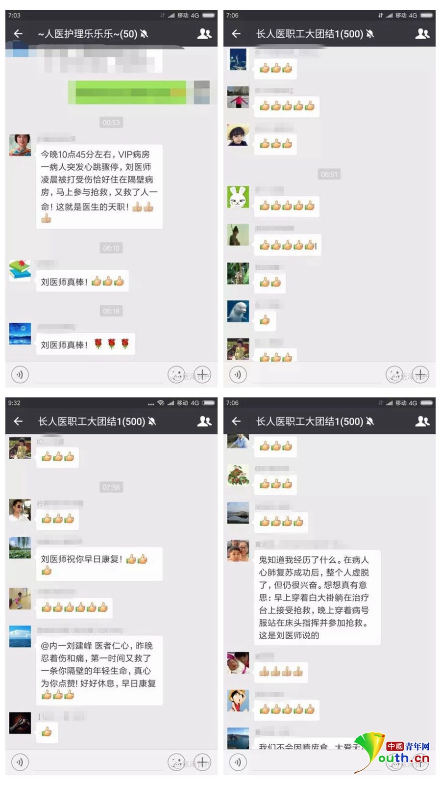 结束抢救后,刘建峰在微信上写了这么一句话:“鬼知道我经历了什么。在病人心肺复苏成功后,整个人虚脱了,但仍很兴奋。想想真有意思:早上穿着白大褂躺在治疗台上接受抢救,晚上穿着病号服站在床头指挥并参加抢救。”