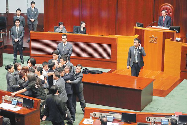 11月2日,香港立法会保安在主席的要求下将闯入会场的梁、游二人驱离会场。