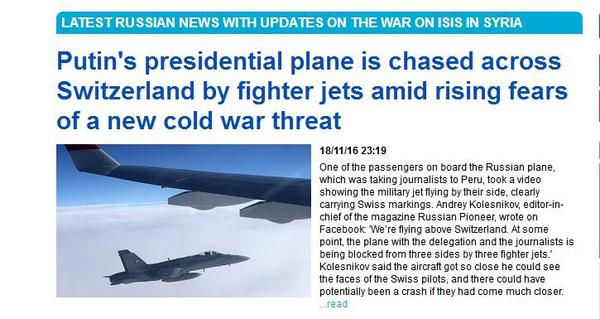 《每日邮报》报道称,俄罗斯先锋杂志主编安德烈·科列斯尼科夫(Andrey Kolesnikov)在脸书上发文表示,自己和其他记者以及代表团遭三架瑞士战机包围拦截。