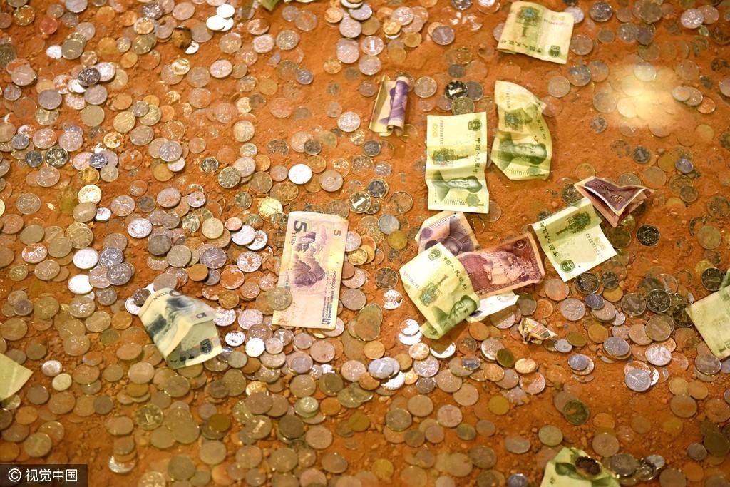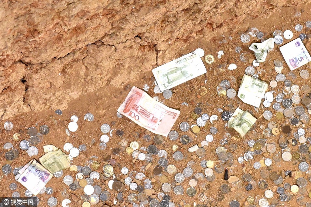 除硬币外,散落在地的还有花花绿绿的纸币,面额从1元到50元不等,甚至有100元的。