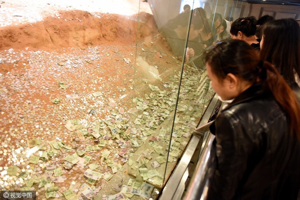 在浙江杭州雷峰塔地宫遗址,不少前来参观的游客都往遗址内扔钱。