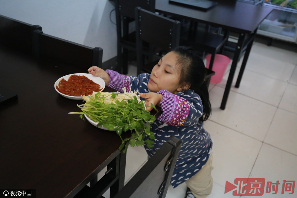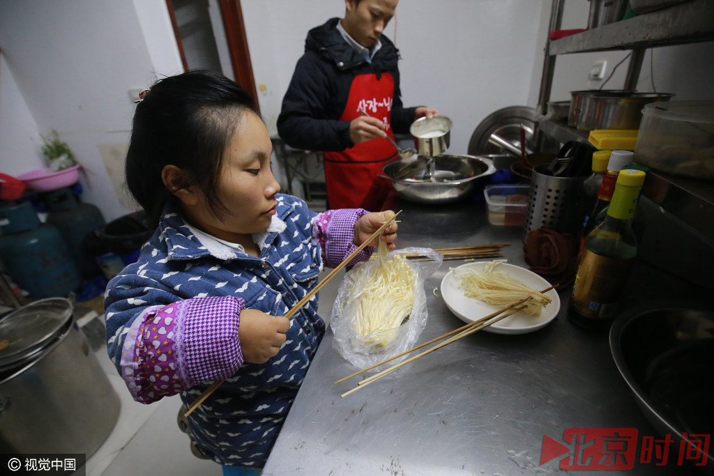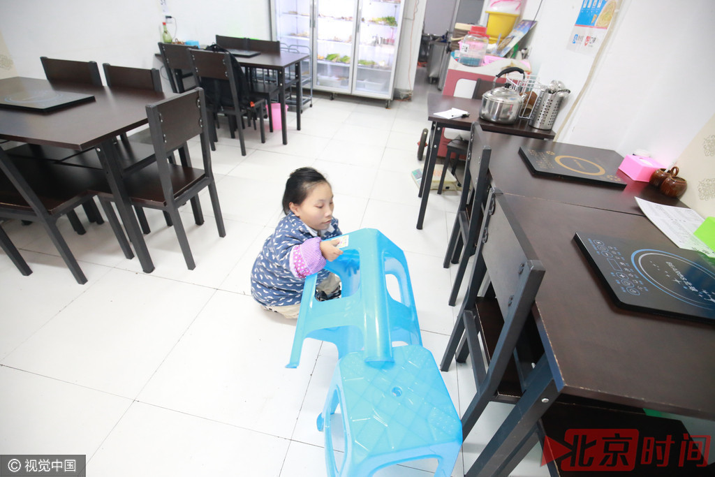 昨天中午,渝北区空港大道的20多平方米的店面里只有五张桌子,只有门边的方桌上有客人,其余桌子都空着。“妹妹,还要盘毛肚!”桌上的客人开口点菜,江海洪站起来往后厨走,在比自己还高的餐桌中穿梭,让身高仅有88厘米的她看起来更加矮小。