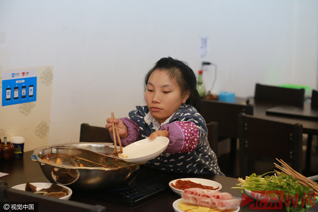 平日里,虽然端菜、炒料等后厨的事情都有身高正常的爸妈和自己天生聋哑的老公帮忙,但店里没有客人需要招呼时,江海洪仍会多帮些忙。图为江海洪向鸳鸯锅里面放置配菜。