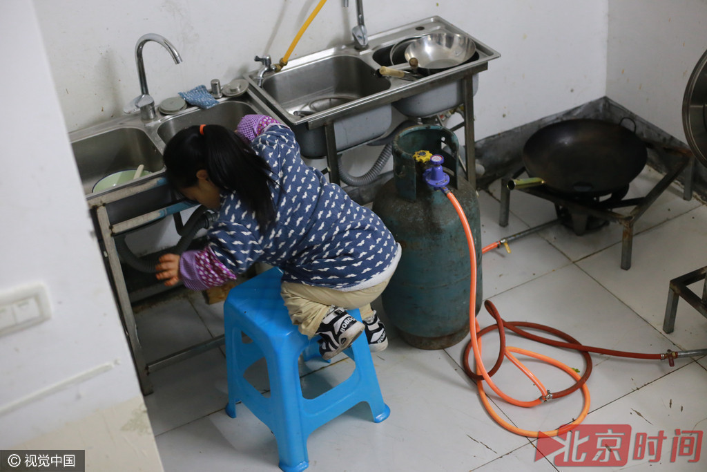 听着邻居们善意的提醒,江海洪看着一直躺在身边婴儿车里只有3个月大的儿子阳阳笑了笑:“我不想挣大钱,我就想能让他像别人的孩子一样长大。”图为江海洪通过凳子加高艰难的爬上去,准备清洗双手。