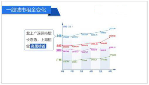 今年8月,58同城发布了《2016上半年租房市场报告》中显示,全国租房需求总量上半年均有提升,一二季度环比、同比增幅明显。其中,3月租房需求最旺。北上广深均保持增长态势,租金方面,上海、北京、深圳的租金均超出4000元/月,其中,上海以5133.91元/月高居榜首。而广州的房租在全国城市租金TOP30中排行第7,6月房租也涨至2793.26元/月,环比上涨0.018%,6月房租远高于1月房租起始线。