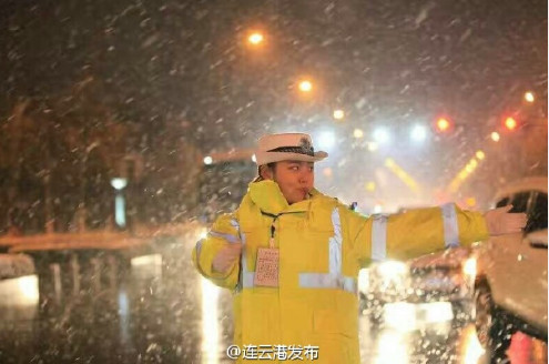 今天下午晚高峰,港城首场降雪依然很大,但是连云港交警海州一大队女子中队陇海岗的陈姿璇一直坚守在自己的岗位上,一起为她点赞。