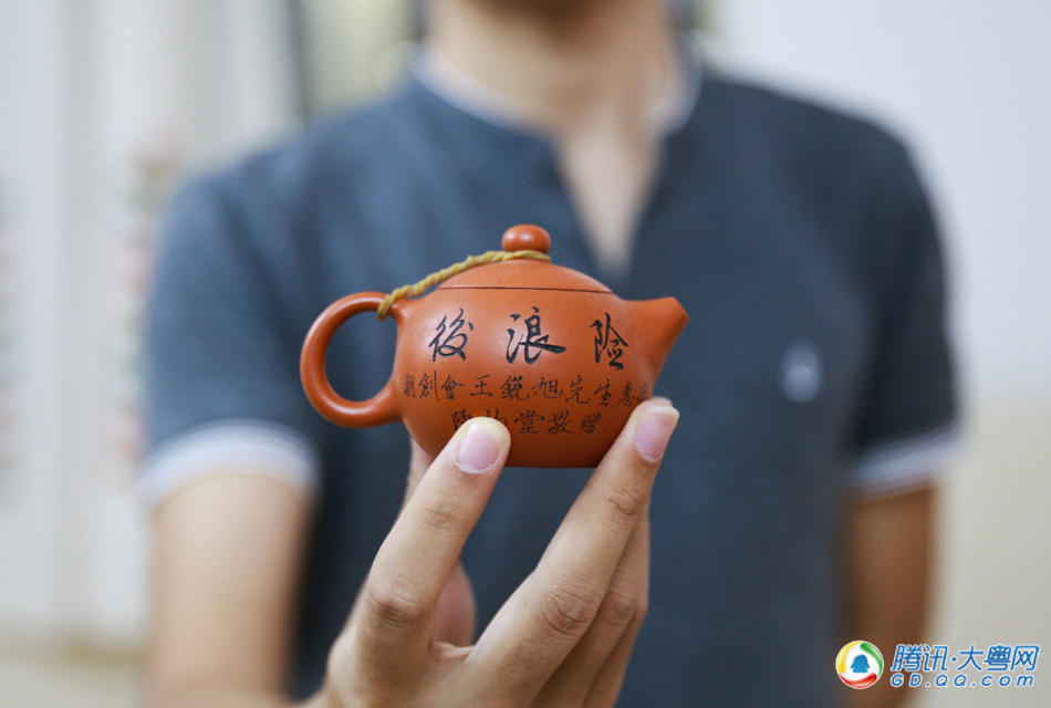 架子上有个潮创会送给王锐旭的茶壶,茶壶上有“后浪险”三个字,此外背面还刻着“先浪面”,“先浪面后浪险”是潮汕一句土话,大致意思为先低头做人后抬头翻身。这是不少创业者在拿到融资前后的真实写照。 (来自:腾讯大粤网)