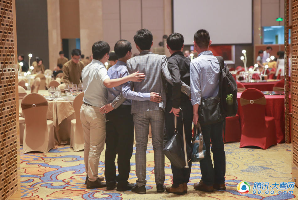 王锐旭迎接前来参加婚礼的投资人。婚礼除了邀请双方家长,还有公司的投资人、创业圈内的好友、公司的新老员工以及媒体记者,从参加的人员来看,这更像一个公司年底举办的年会。 (来自:腾讯大粤网)