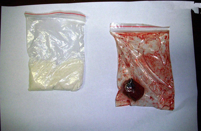 图为少女身上搜到用来制作“处女血”的鸽子血和白色粉末。作案手段是:利用未成年少女引诱嫖客,男子冒充少女的家人冲进房间扬言要告嫖客,以此敲诈勒索。