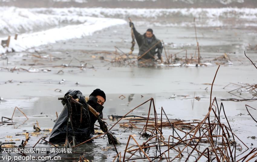 2016年11月24日,湖北省襄阳市,挖藕人在襄城区姚庵村一处藕塘清除藕塘浮冰。(杨东/人民图片)