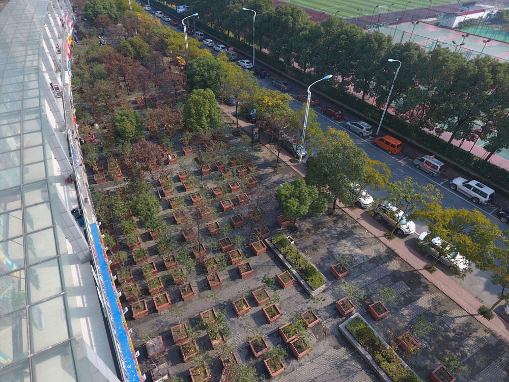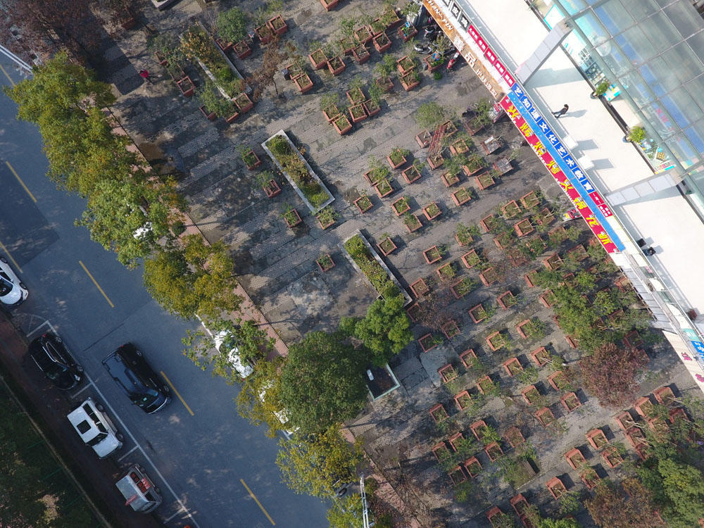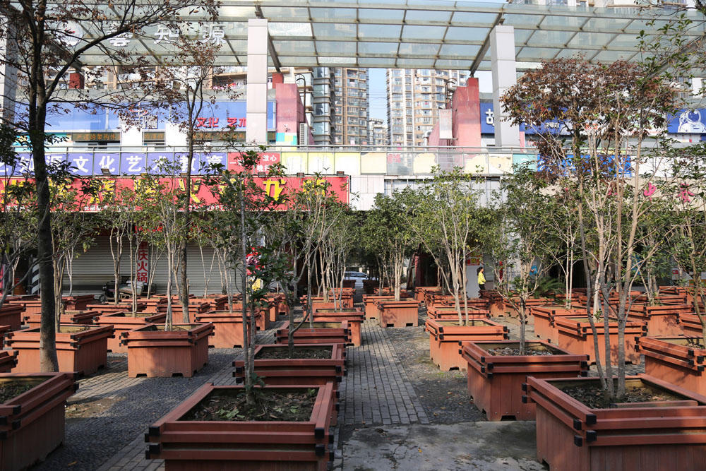 2016年11月24日,江苏苏州,钟慧路一段长约40米的开阔人行道上放置了419个大型树箱,种满了桂花树。这些盆栽是城管部门为遏制沿街店铺占道经营而设置的,盆栽间隔很小,不影响市民走路,但能有效防止占道经营行为。(图/东方IC) (来自:腾讯图片)