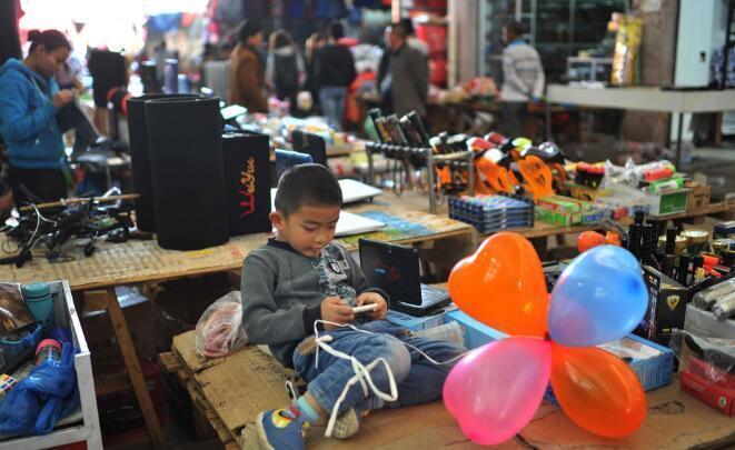 图为南伞街头集市上,一个孩子在悠闲地玩手机。