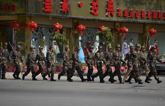 11月22日,缅甸内战战场一颗炮弹落在中国境内,在地上爆炸后留下大约1米宽,70多厘米深的大坑。爆炸地点距离芒海镇设立的难民临时安置点仅约200米,所幸没有造成人员伤亡。几十年来,尽管缅北内战频繁爆发,但与缅北仅仅一步之遥的中国境内,却是一片祥和,中国百姓吃饭睡觉一如往常。一年前,摄影师深入缅北战乱现场,亲身感受到国境线两边的不同。图为中缅边境云南南伞镇街头,中国武警在出勤。
