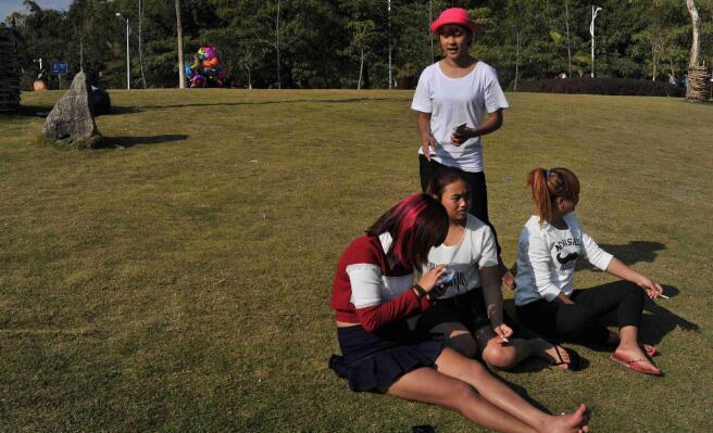 夜晚的南伞更是灯火辉煌,年轻人照样用进咖啡厅和KTV,享受浪漫时光。23岁的海燕是一家酒店的服务员,虽然是外地人,但也在南伞已经生活三年时间,她说,果敢那边内战打响后,最初几天她有些紧张,后来感觉没啥事,现在一点也不害怕。她也没有感觉到整个县城有什么变化,唯一让她感受到不同的话,就是酒店里住宿的挂牌牌的工作人员和军人多了,街头挂着黑色“KK”果敢牌照的汽车多了。图为南伞街头公园里休闲的年轻人。