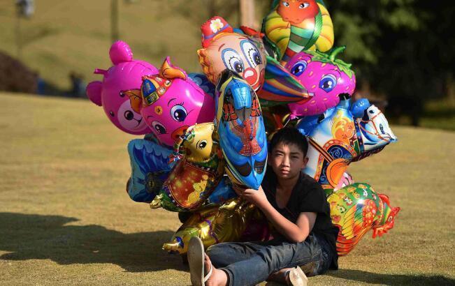 街头熙熙攘攘,人们忙着逛集市,公园里人们在放风筝,遛狗,享受休闲的阳光,丝毫没有几公里外就是战场的紧张气氛。图为南伞镇区公园里卖气球的小贩。