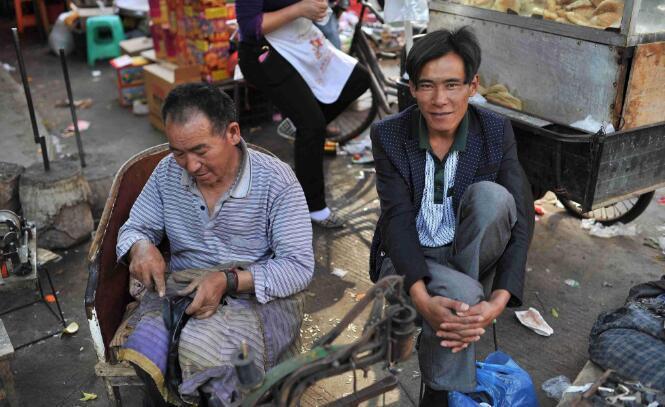 在集贸市场上正在卖菜的老韩与海燕的感受不同。他每年都要街上卖菜,他感觉今年明显比往年人多了很多,生意也好了很多,其中有很多是难民。这些难民中有很多原来生活条件并不是很差,在南伞甚至租住民房或者酒店避难,尽管战争所迫,但很多难民在大年三十还是要改善一下伙食。老韩说,缅甸打仗已经不是一次两次了,他活了60年,经历过很多次,距离中国虽然很近,但却又像很遥远,因此从来也没有害怕过。图为南伞街头修鞋的鞋匠。