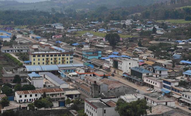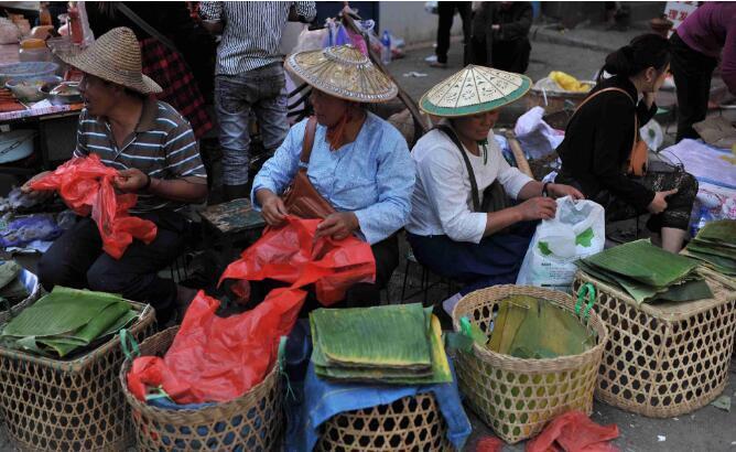 2015年,缅甸果敢内战爆发后,大批的难民逃向邻近的中国云南南伞镇。在缅甸境内战火纷飞之时,国境线两边状况迥异。一边的缅甸果敢战火纷飞,流离失所,逃往他乡。一边中国南伞小镇上班、休闲、吃饭睡觉,一片祥和。图为南伞街头集市上卖土产的当地百姓。