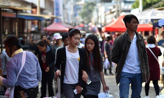 南伞镇距离缅甸果敢自治区首府老街仅有10公里路程,随着果敢内战爆发,大量难民的涌入,原以为此刻的南伞镇应该很紧张。然而摄影师从德宏傣族景颇族自治州首府芒市驱车,穿越200多公里盘山公路,6个小时后抵达南伞镇时,看到的却是另外一番景象。图为南伞街头逛集市的年轻人。