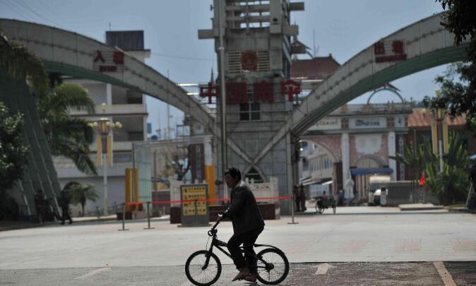 2009年8月果敢内乱,大多数难民是通过南伞国门路口岸逃向中国。此次则不同,摄影师在南伞著名的国门口岸,看到的是一片冷清,除了有少数公安在维持秩序,一些边防武警在执勤外,甚至看不到一个难民。而此次难民大多集中在距离县城5公里外的工业园区。图为南伞通往缅甸的关口冷冷清清。
