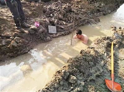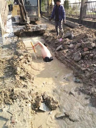 24日的扬州,最低气温接近冰点。在一处抢修现场,一位工作人员赤裸着上身,只穿了一条内裤,俯身在一条宽约1米的水沟中作业,时而用双手在水中摸索,时而操起工具在水中挖掘。就这样在大冷天的水中泡了40多分钟,完成了作业。网上发帖的是“赤膊哥”的工友王友刚,他告诉记者,“赤膊哥”名叫张福干,今年40多岁。他们来自宿迁,都在扬州市自来水公司一家安装公司工作。