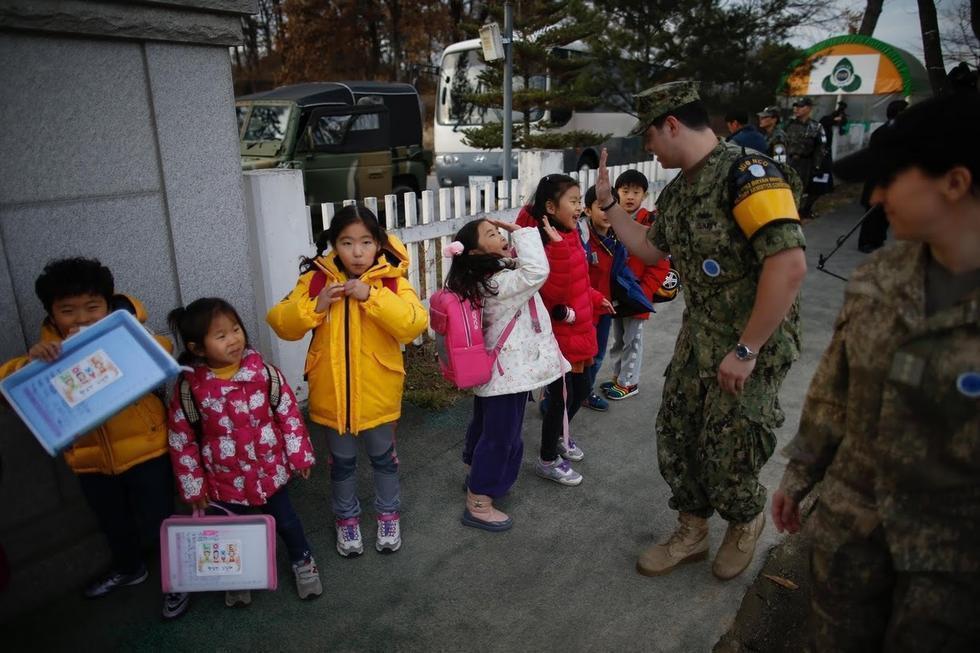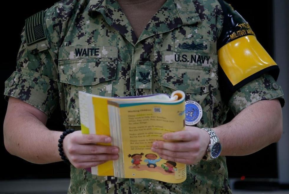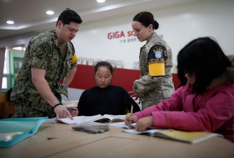 布莱恩-怀特是一位22岁的美国水手,他是学校的志愿者。“学生们很小就开始接触英语,了解到什么是非军事地带,以及这对他们的生活和历史产生了怎样的影响,这是非常独特且重要的体验。”