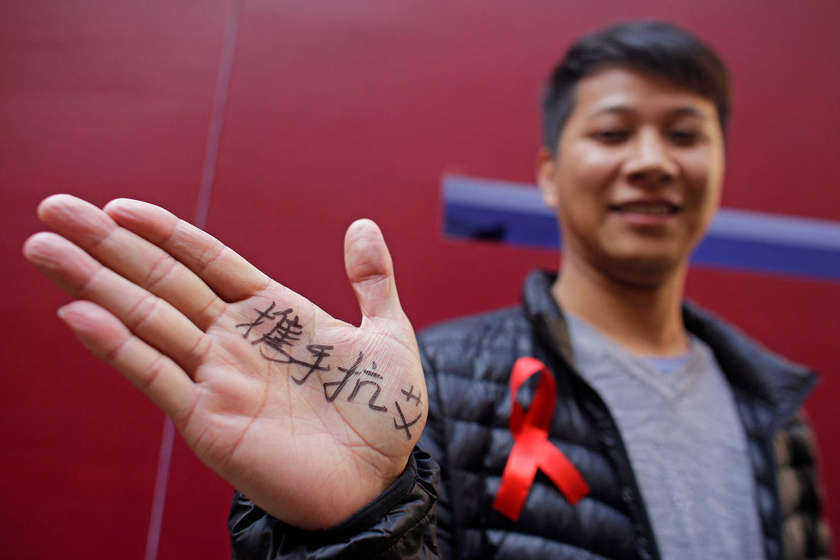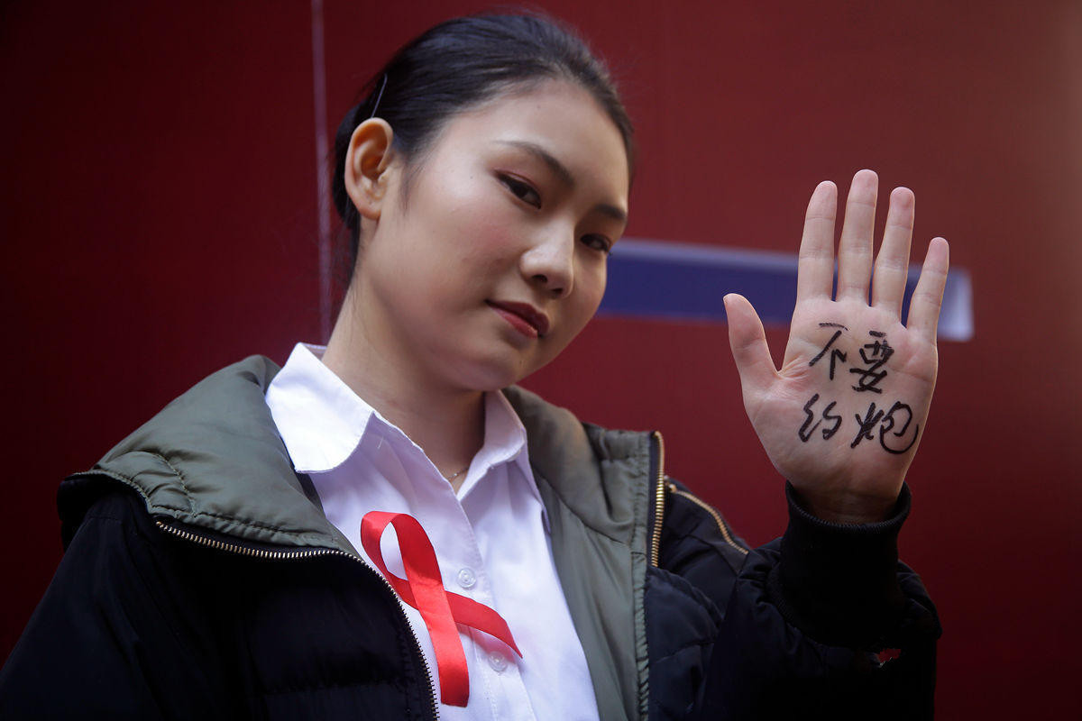 一名参与者的手掌上写着 " 不要约炮 " 的字样。