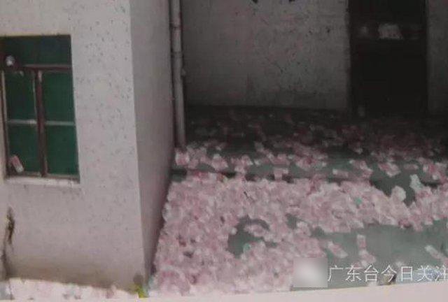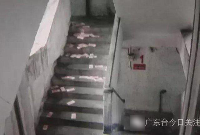 街坊拍摄的照片可以看到,在楼梯间的石围栏以及楼梯上都散落了不少红色的纸张。照片放大清晰可见,全部是红色的100元人民币。