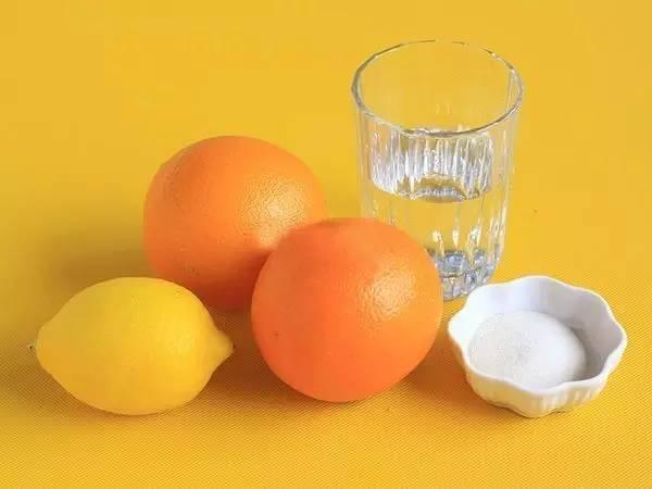 先准备食材:橙子2个、果冻粉(或鱼胶粉)50克、温水50ml、柠檬汁5ml。
