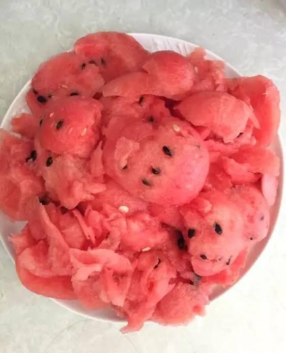 步骤5:拿出来还是完整的一半西瓜。切成片,贴上几个西瓜子,更加形象生动!