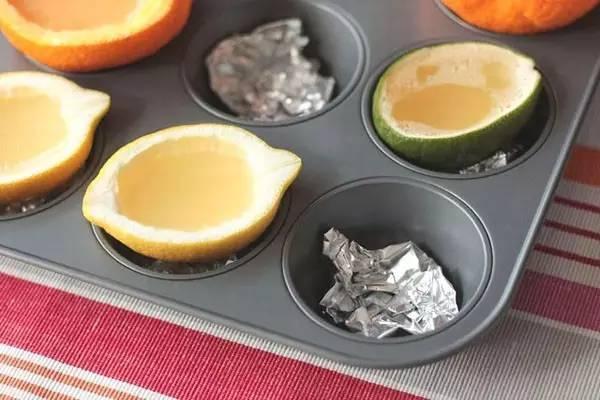 步骤1:挖去果肉,榨汁,将果汁和果冻粉(或鱼胶粉)倒入果皮中。