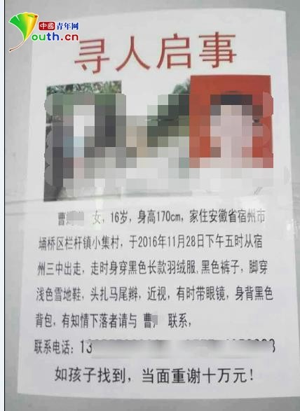 11月30日一则寻人启事在宿州市当地流传,寻人启事称,曹某某,女,16岁,于2016年11月28日下午五时从宿州三中出走。