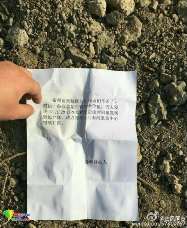 在打捞当天(12月4日)上午,曹先生在河边看到了一张字条,字条提醒蓝天打捞队以“郑桥庄后面的河为中心继续打捞”,果真在字条指示的位置捞到了遗体。曹先生疑惑,为什么蓝天救援队打捞3天没有找到遗体,而与渔民协商好价格后3小时,曹某某的遗体就被打捞上来。曹先生认为,此前一定有人知道遗体位置,并暗中提醒。