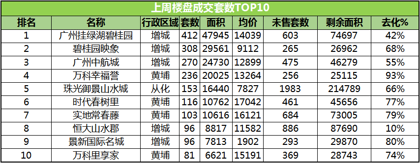 成交套数TOP10:增城区的广州挂绿湖碧桂园412套夺魁