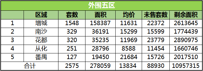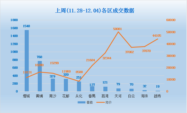 具体到每一区,其中增城夺得销冠,共成交1548套;而成交套数最少的则是越秀只成交了19套。