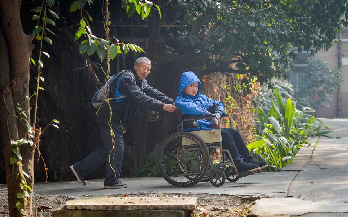 考上大学后,爷爷和父亲就跟来成都,一家人租住在学校北苑的家属区里。每天,贺学鹰用轮椅推着孙子,经过艺术学院的大楼,再走上几百米,到达教学楼。贺学鹰把孙子背上身,一步一步踏上楼梯。每走一步,老人都会轻声喘口气。