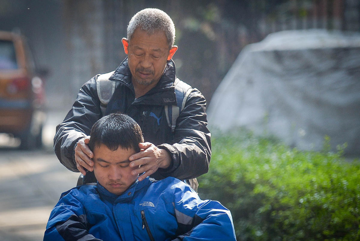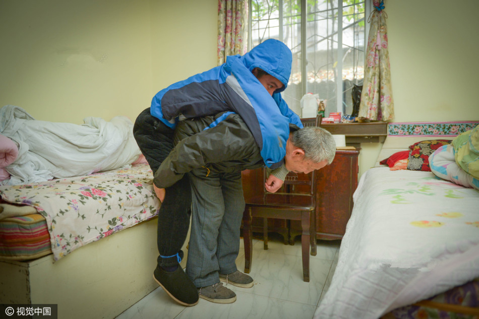2016年12月6日,成都。贺铃峻童年时被确诊为“进行性肌营养不良症”,双腿逐渐失去力气,直到不能站立、行走。十年来,只能依靠爷爷和父亲,背着他到学校上学。供图:视觉中国