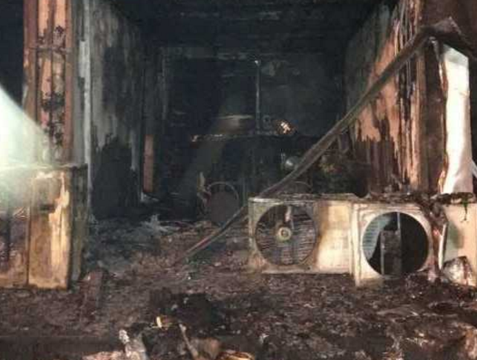 记者赶到现场时,现场的火势已被扑灭,外围拉起了警戒线。这是一处临街的铺面,一楼一连三间门面房均被烧毁,里面漆黑一片。其中,失火的小饭店是两个门面,里面桌椅均被烧坏,隐约能看到桌上摆放的一些钢制的器具,铮亮的外壳与烧得焦黑的桌子形成强烈的反差。从二楼至三楼外墙,均被熏得漆黑。门口处四台空调烧得只剩下空壳,同时停在门外的多辆电动车,也烧得只剩下骨架。