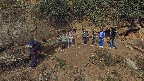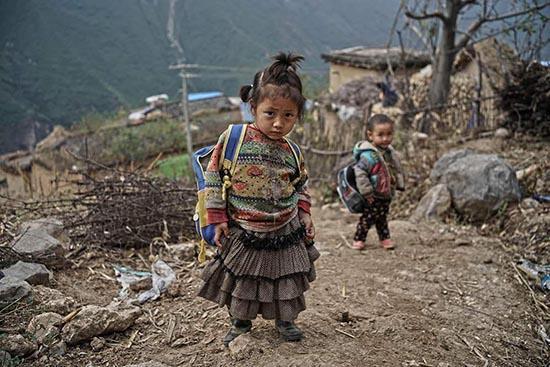 教室距崖边只有几十米,崖下是数百米深的大峡谷,崖边没有任何障碍物。为保证安全,陈龙不允许孩子走出院子。放学时,必须由家长把孩子接回家。图为11月14日,上学路上的两个孩子,后面跟着家长。