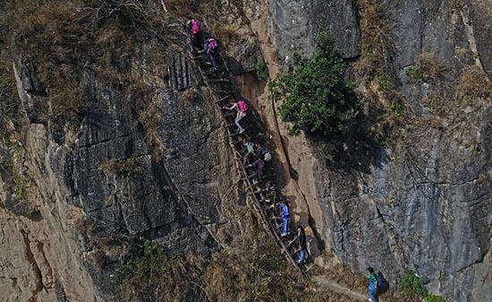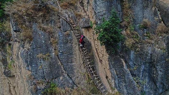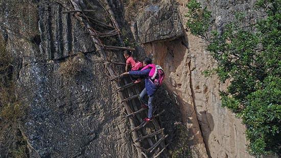 哈甘乡瓦屋村是凉山彝族自治州现存的19个“悬崖村”之一,现有户籍人口约700多人。瓦屋村通向外界有两条山路,都非常险峻,有些路段是几乎垂直的悬崖,需要借助藤条、钢索,或者攀爬藤梯才能上下。陈龙从家里到学校需要4个多小时。
