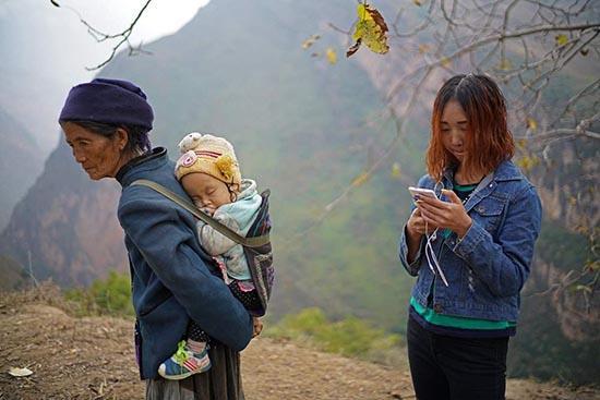 图为瓦屋村靠悬崖边处,打工回家的芳芳用手机聊天。这是村里唯一有信号的地方。