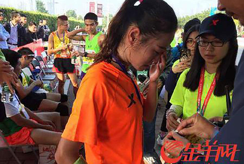 早上9:00左右,来自东莞的第一位女跑友殷晓雨冲线,这是她第一次参加广马,没有给自己计时。 (来自:腾讯大粤网)