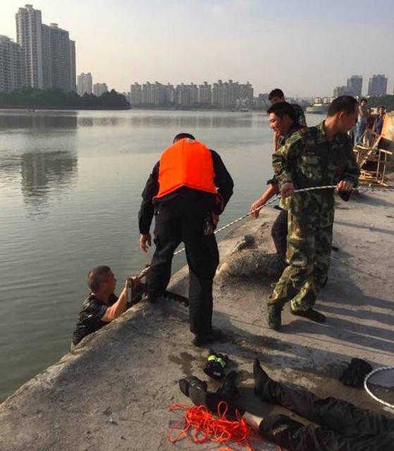昨晚7时许,两辆特警车辆赶到现场,其中一辆警车升起探照灯,另一辆警车的警员穿起了潜水服。半小时后,按照特警现场指挥方案,潜水员下水砸碎车窗,将吊绳横穿车顶。潜水员下水后,先后三次潜水作业,第一次找到坠河的车辆,第二次砸碎车窗,第三次完成穿绳并挂在吊车钩子上。晚8时05分,在岸上吊车的作用下,一辆黑色凯美瑞轿车浮出水面。车被吊起来后,警方当即打开车尾箱检车。车尾箱内有一本工程招标书,还有一些病历本。从浸水后的病历上隐约看到,病历上的人姓莫,年龄49岁。 (来自:珠江晚报)