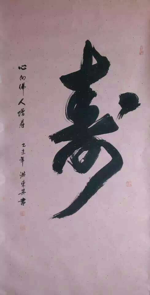 洪君此寿字雄伟,如裴将军舞,下笔曲折,宛转回向,飞动有势,结构紧密,周旋中礼,神采逼人,意态自妙,盖笔力深厚之故耳。