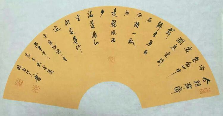 此洪君之扇面行草书,贵在虚实并见。虚实之间,仅凭腕肘控制,指笔合拍,尽一身之力而送之,风采神韵委婉华丽而无拘束之效生焉。