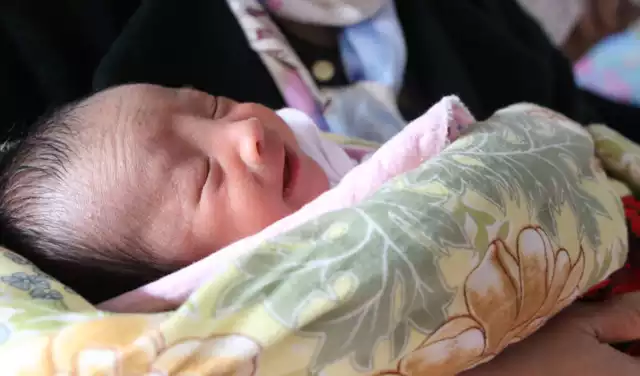 “十二日”这一天几乎全村的老百姓都到他们家里道喜祝贺。图为襁褓中的婴儿,面对前来祝贺的亲朋他的小脸上似乎露出了笑容。