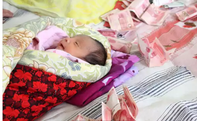 王爱英预产期是12月12日,11月28日她原本是计划去医院做产前检查,医生发现她羊水过少,必须马上进行剖腹产手术,吴凤华夫妇就这样即突然又幸运地迎来了第二个儿子。图为祝贺的亲戚按照当地风俗给孩子“长钱”,寓意孩子健康成长。